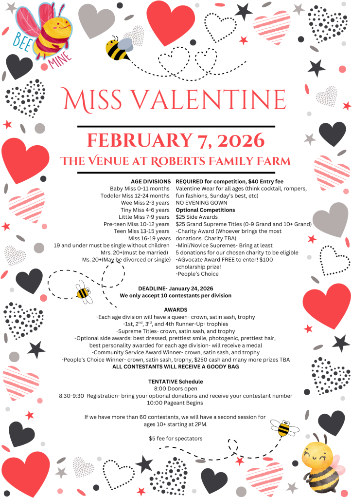 Santa's Workshop The Venue at Robert's Family Farm 115 Kennedy Road Guston, KY 40142 November 28th and 29th, 2025 1:00-7:00PM More Info Miss Valentine Pageant The Venue Robert's Family Farm 1215Kennedy Road Guston, KY 40142 Saturday, February 7, 2026 10:00 AM EST More info Let's make some memories! Plan your visit